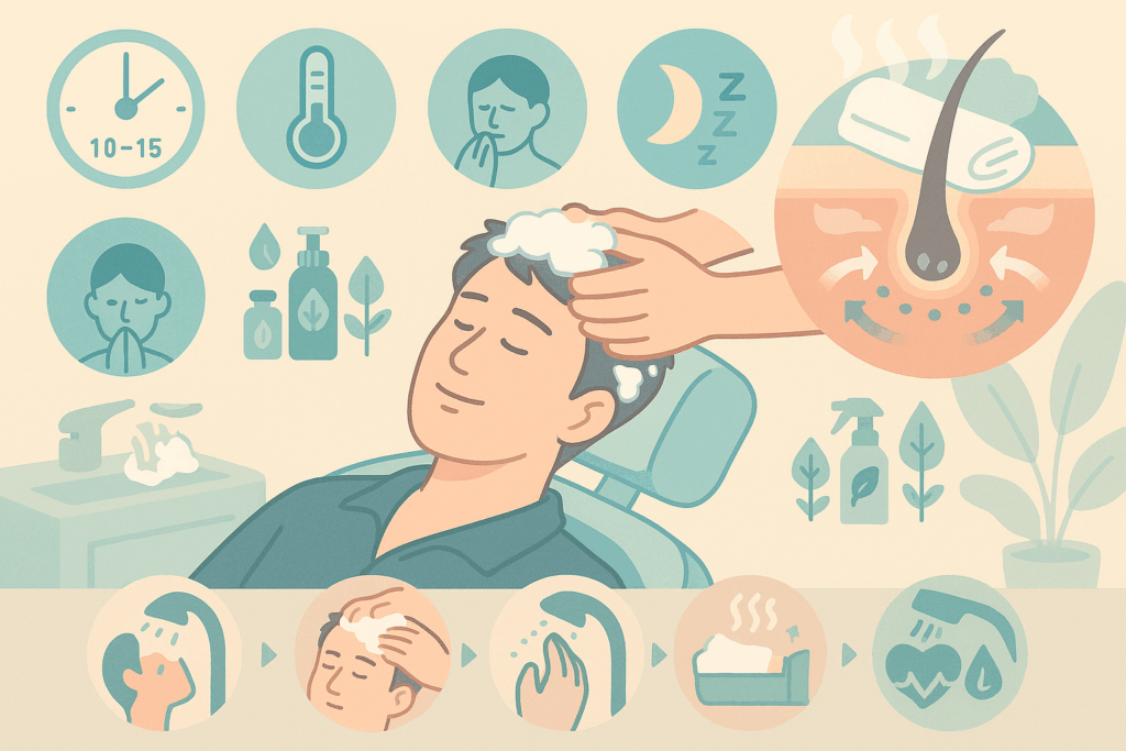 頭皮を清潔に保ち、やさしいマッサージでコンディションを整え、リラックス時間をつくることです。外見の印象づくりにもつながりますが、医療的な効果を断定するものではありません。