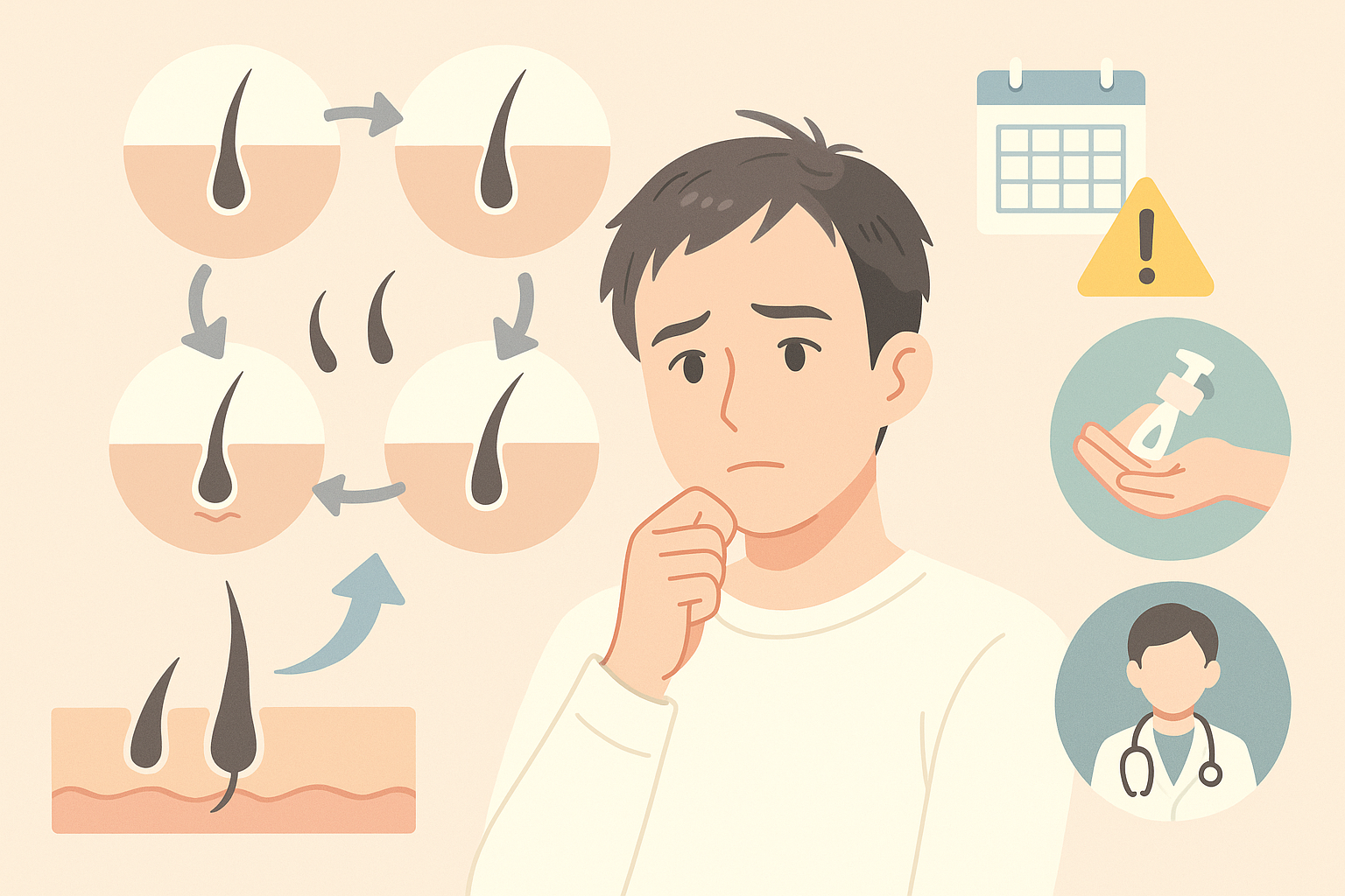 ただし、AGAの本態はDHTによる毛包のミニチュア化であり、進行抑制には5α還元酵素阻害薬(フィナステリド等)の内服が最もエビデンスが高いとされています。